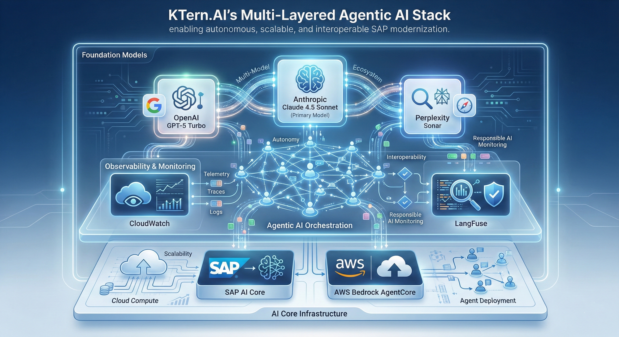 The technical foundation of AKaaS lies in KTern.AI’s multi-layered Agentic AI tech stack — a system purpose-built for scalability, interoperability, and autonomous performance in SAP modernization environments.