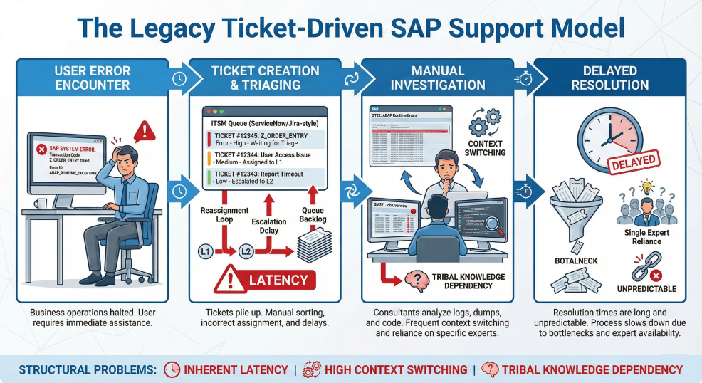 For decades, SAP support has been organized around a ticket-based model. A user encounters an error and logs a ticket in an ITSM tool. The ticket is triaged, reassigned, escalated, and eventually someone with the right skills picks it up. That consultant then starts the detective work: looking at system logs, error messages, dumps, job logs, custom code, and data.