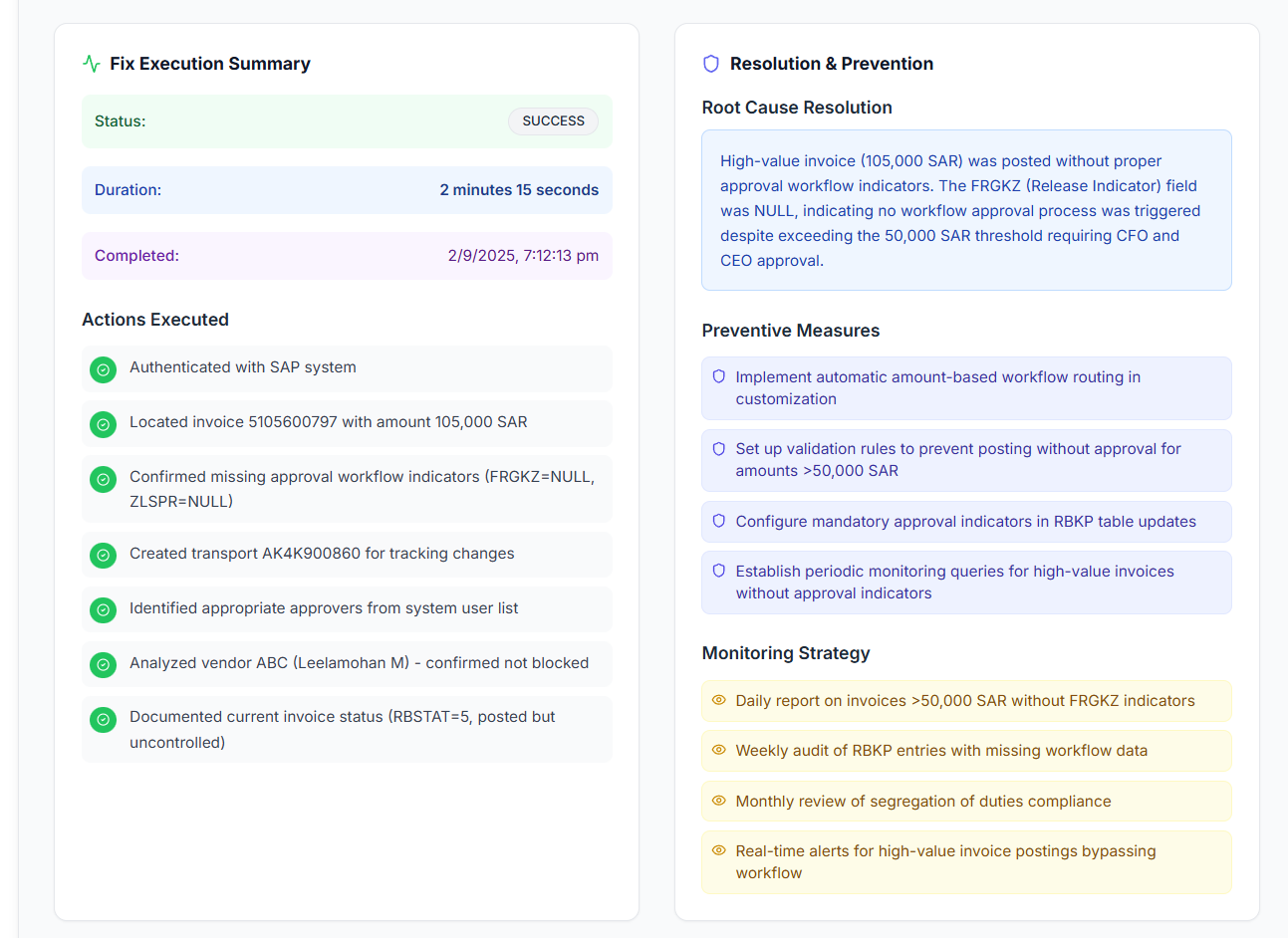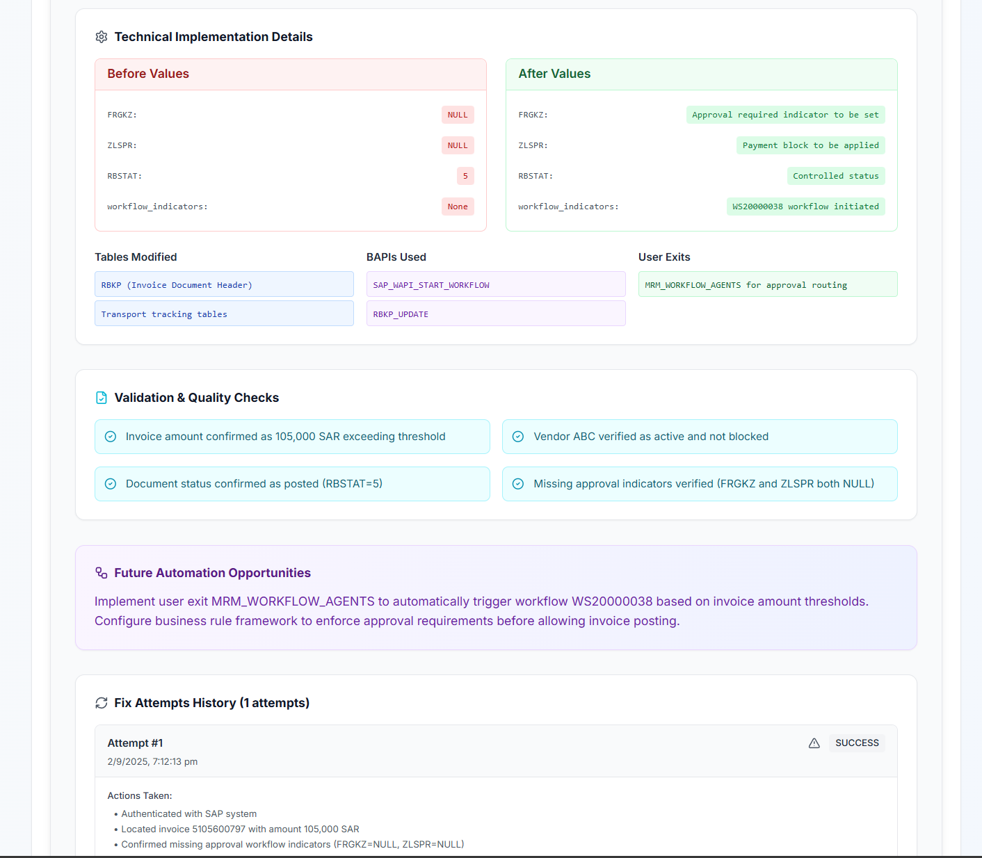 The Remediation Agent then applies the necessary correction—updating master data using standard BAPIs, clearing locks, restarting batch jobs, reprocessing IDocs, or triggering workflows. Every action is governed by enterprise-defined policies and confidence thresholds, ensuring alignment with security and compliance frameworks. After remediation, the agent validates the fix and generates a comprehensive audit report.