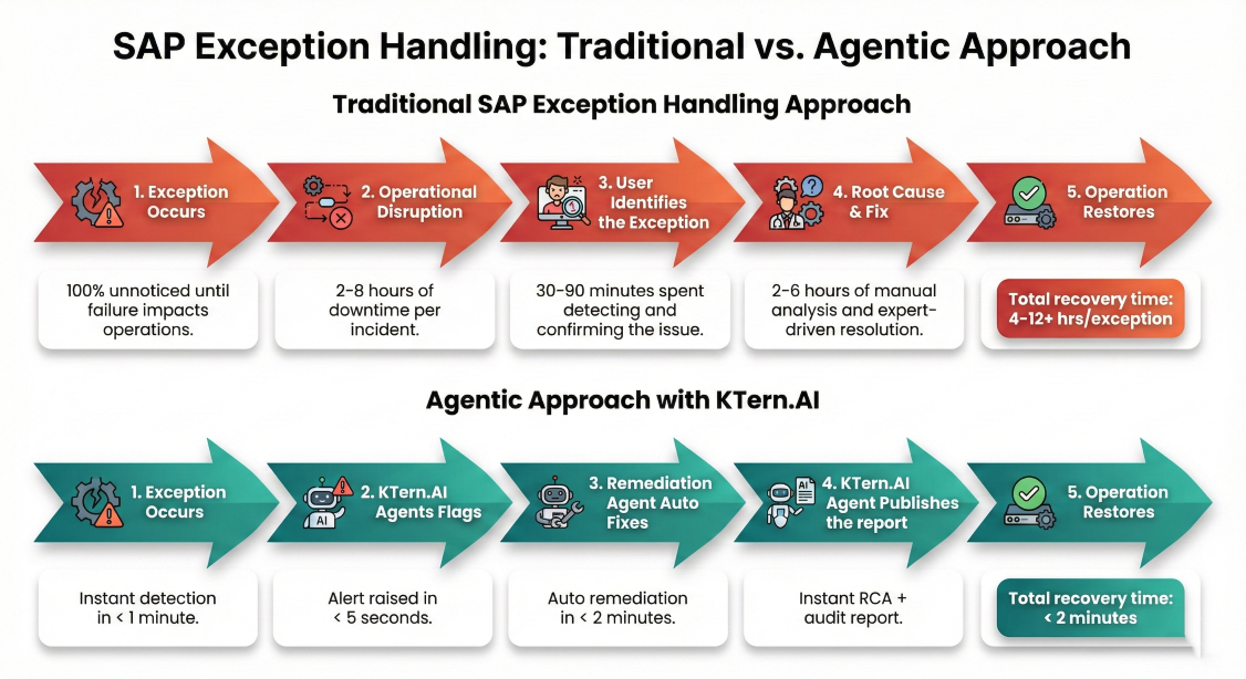 In the traditional operational model, the SAP environment often functions as a "Black Box" during failure events. When an exception occurs, whether it is an IDoc failure in a supply chain interface, a payment run crash in FICO, or a master data inconsistency, the immediate visibility into the problem is near zero. In a standard non-AI environment, an exception remains "100% unnoticed until failure impacts operations". This lag creates a cascading effect: a technical error becomes a business process interruption, which eventually manifests as a financial loss or customer dissatisfaction.
