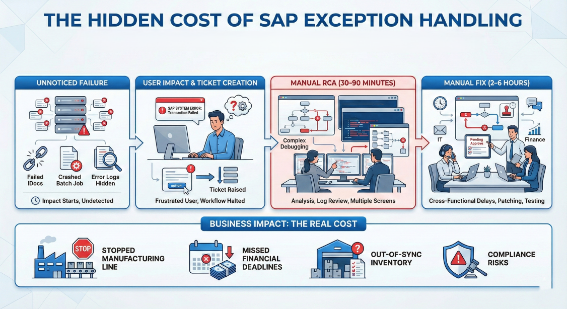 In today’s manual regime, diagnosing which kind of exception you are dealing with means jumping across multiple T-Codes, reading logs, debugging code, and coordinating between Basis, functional, and development teams. Even in the best-run organizations, this is slow, inconsistent, and dependent on the presence of specific experts. It is the opposite of scalable.