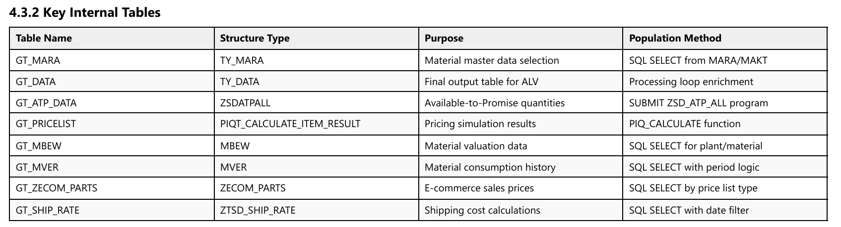 Internal Tables: Complete listing of major internal tables with their structures and purposes.
